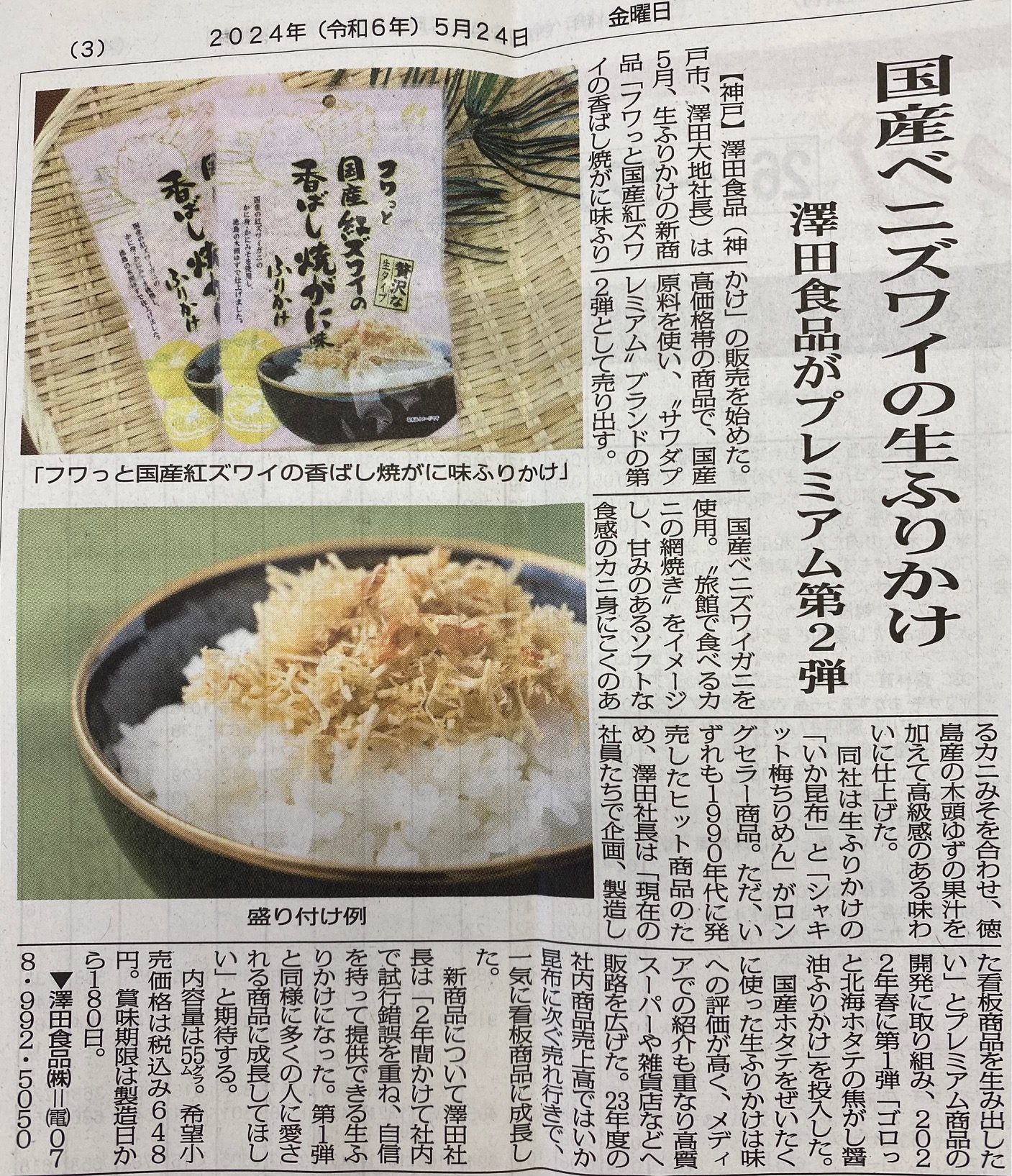 澤田食品株式会社は1961年の創業以来、海産原料を主に使用した商品を港町神戸よりお届けして参りました。厳選された海の幸から、本来の素材の良さを生かし、風味や食感にこだわった商品を最新の設備と徹底した衛生管理のもと、他社にはない新製品の開発に取り組んでまいりました。そうしたなか、今日まで皆さまに幅広くご愛顧頂いております。弊社の看板商品が「いか昆布」や「シャキット梅ちりめん」をはじめとする生タイプのふりかけシリーズです。今後も創意工夫を重ねた当社独自の製品づくりにご期待ください。