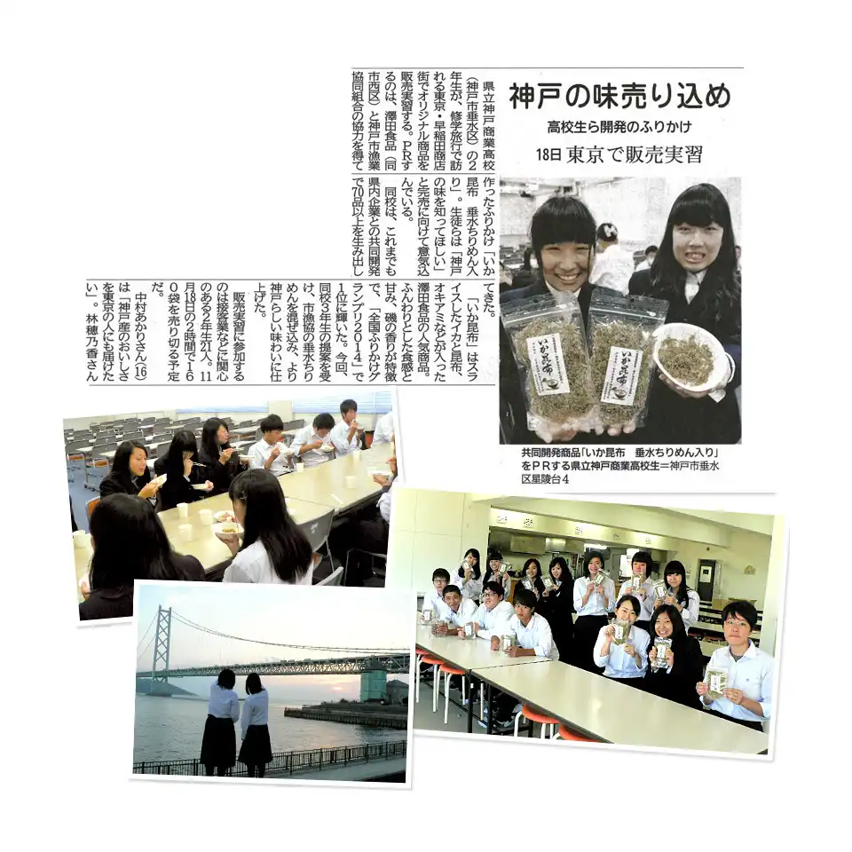 当社では、神戸市漁業協同組合の協力のもと、実践的な商業教育の一環として兵庫県立神戸商業高等学校の生徒の方々と共に、共同開発事業を行っています。活動のなか、当社製品の主力商品である「いか昆布」をベースに「垂水ちりめん」をふんだんに使用、「いか昆布 垂水ちりめん入り」として、より旨味ある商品として製品化を実現しました。また同商品は、平成28年度「五つ星ひょうご」商品としても選定されています。