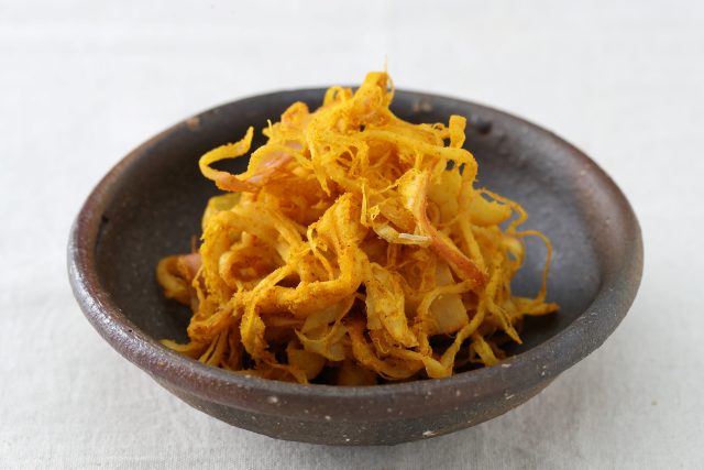 香り高いスパイシーなカレー粉を使用した本格的なカレー味のさきいかです。辛さの中にも奥深いコクと、噛むごとにさきいかの旨みがジュワっとお口に広がります。そのまま召し上がるのはもちろん、天ぷらにすると絶品です!