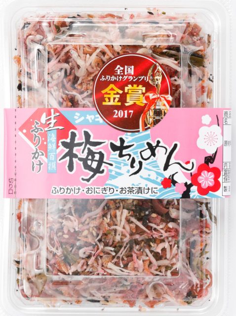 | 原材料名 | 調味梅(梅肉、砂糖、その他)、ちりめん、ごま、ツノナシオキアミ、乾燥しそ(しそ、食塩)、調味野沢菜(野沢菜、食塩、ぶどう糖、砂糖)、鱈すり身加工品(鱈、小麦澱粉、その他)、調味ひじき(ひじき、砂糖、食塩、その他)、わかめ/調味料(アミノ酸等)、ソルビット、酒精、酸味料、着色料(赤102)、(一部に小麦・ごま・大豆を含む) | |