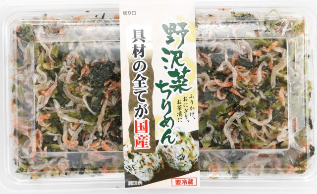 | 原材料名 | 調味野沢菜(野沢菜〔国産〕、砂糖、食塩)、ちりめん(いわし稚魚〔国産〕、食塩)、ツノナシオキアミ(国産)、食塩、調味料(アミノ酸等)、ソルビット | |
