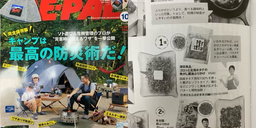 アウトドア専門誌の「BE-PAL」の特集コーナーのキャンプ飯にで、弊社の「ゴロっと北海ホタテの焦がし醬油ふりかけ」が紹介されました。→記事を詳しく見る
