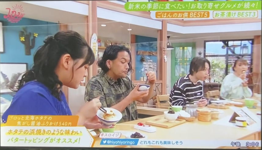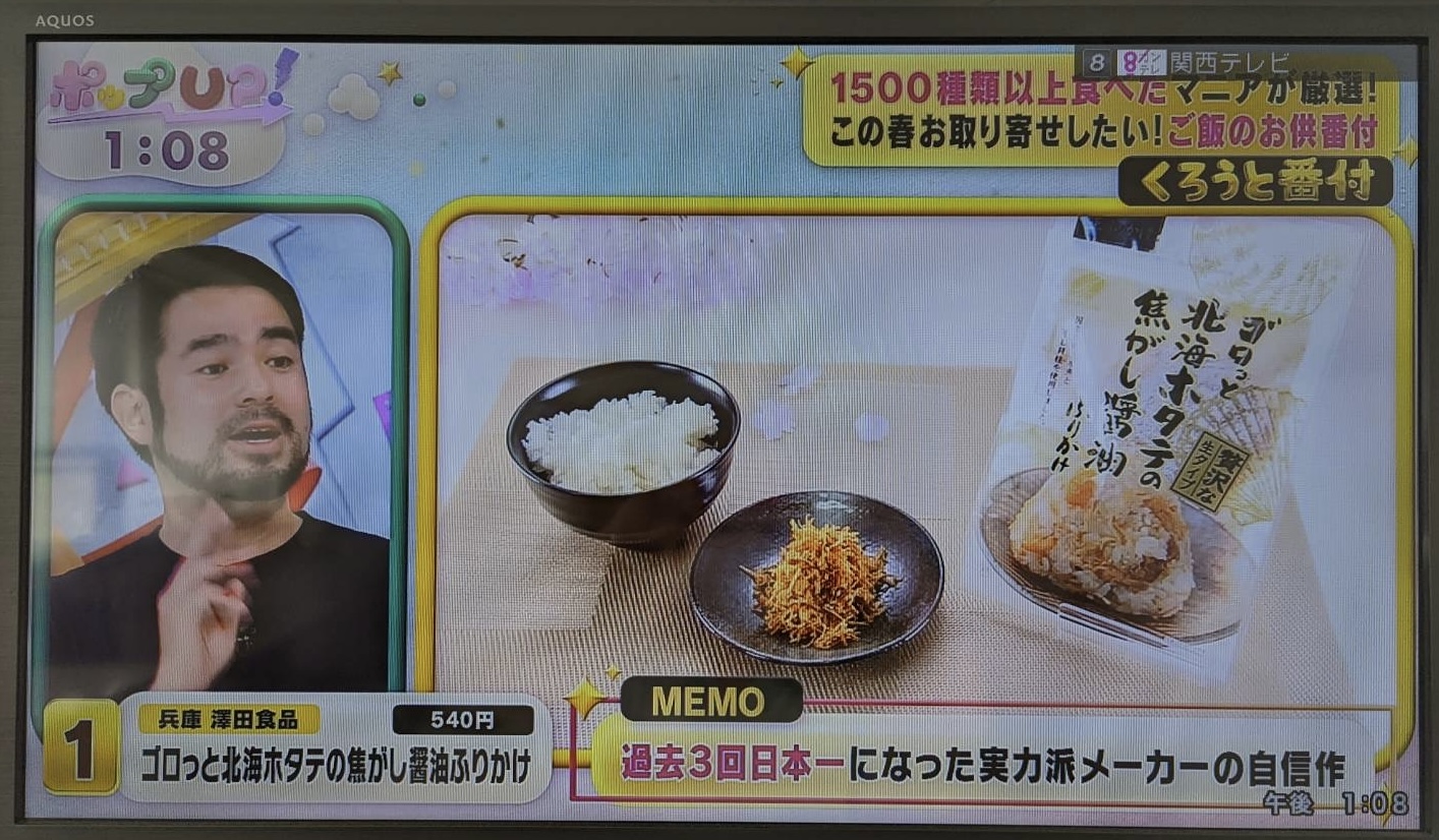 関西テレビの「2時45分からはスローでイージーなルーティーンで!」のコーナー「お取り寄せごはんのお供BEST5」で「ゴロっと北海ホタテの焦がし醬油ふりかけ」が第5位で紹介されました!→記事を詳しく見る