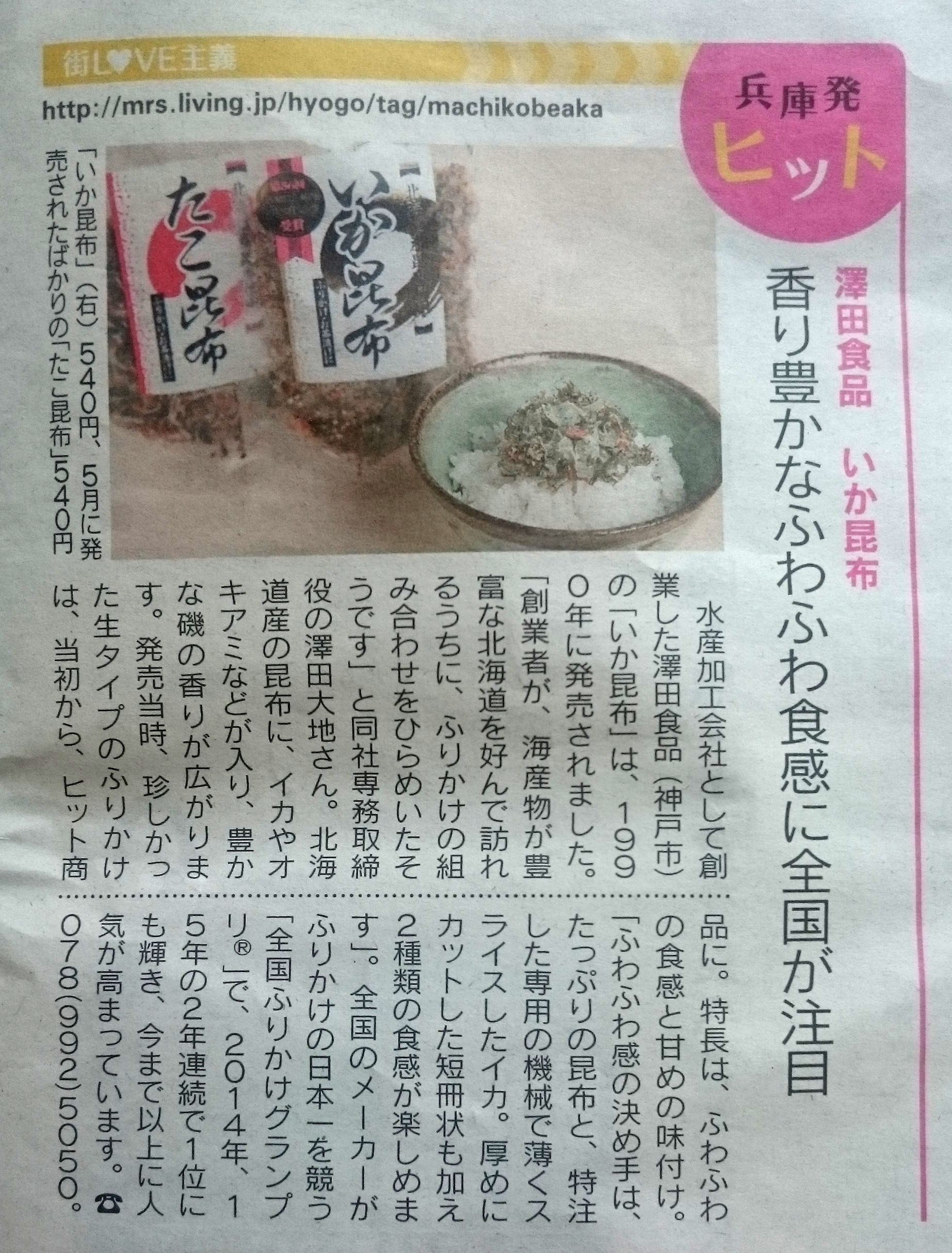兵庫県発のヒット商品として「いか昆布」と、5/15より新発売の「たこ昆布」が紹介されました。→記事を詳しく見る