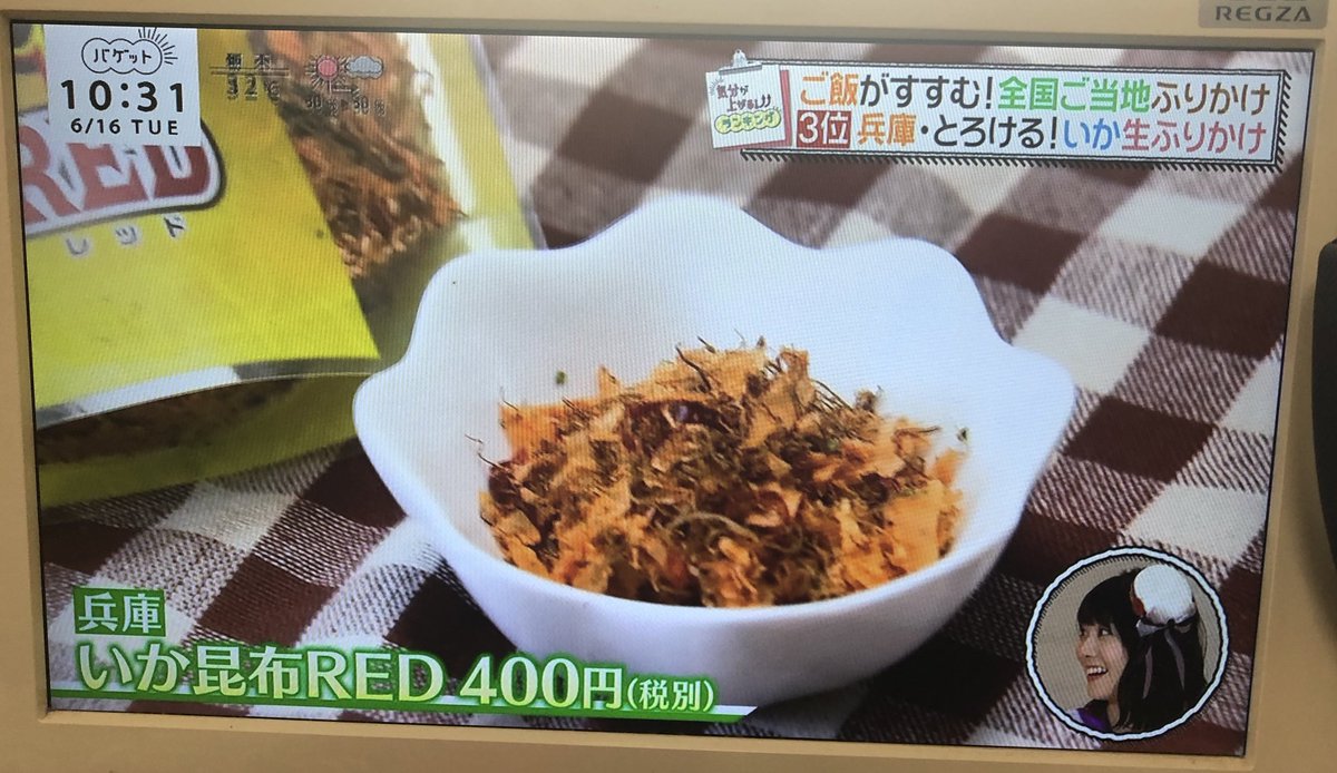 日本テレビの朝の情報帯番組「バゲット」内で「お取り寄せふりかけランキング」コーナーにていか昆布REDが3位になりました!→記事を詳しく見る
